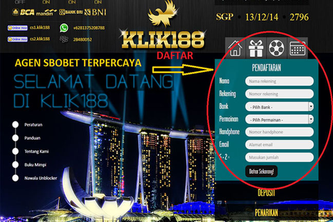 Cara Daftar Judi Online, Daftar Judi Bola , Daftar Akun Taruhan Bola Online, Daftar Poker Online maupun Cara Daftar untuk Bermain Judi Taruhan Online secara mudah, cepat dan aman dapat dilakukan di KLIK188 yang merupakan Situs Judi Online Terbaik dan Bandar Taruhan Bola Terpercaya di Indonesia.
